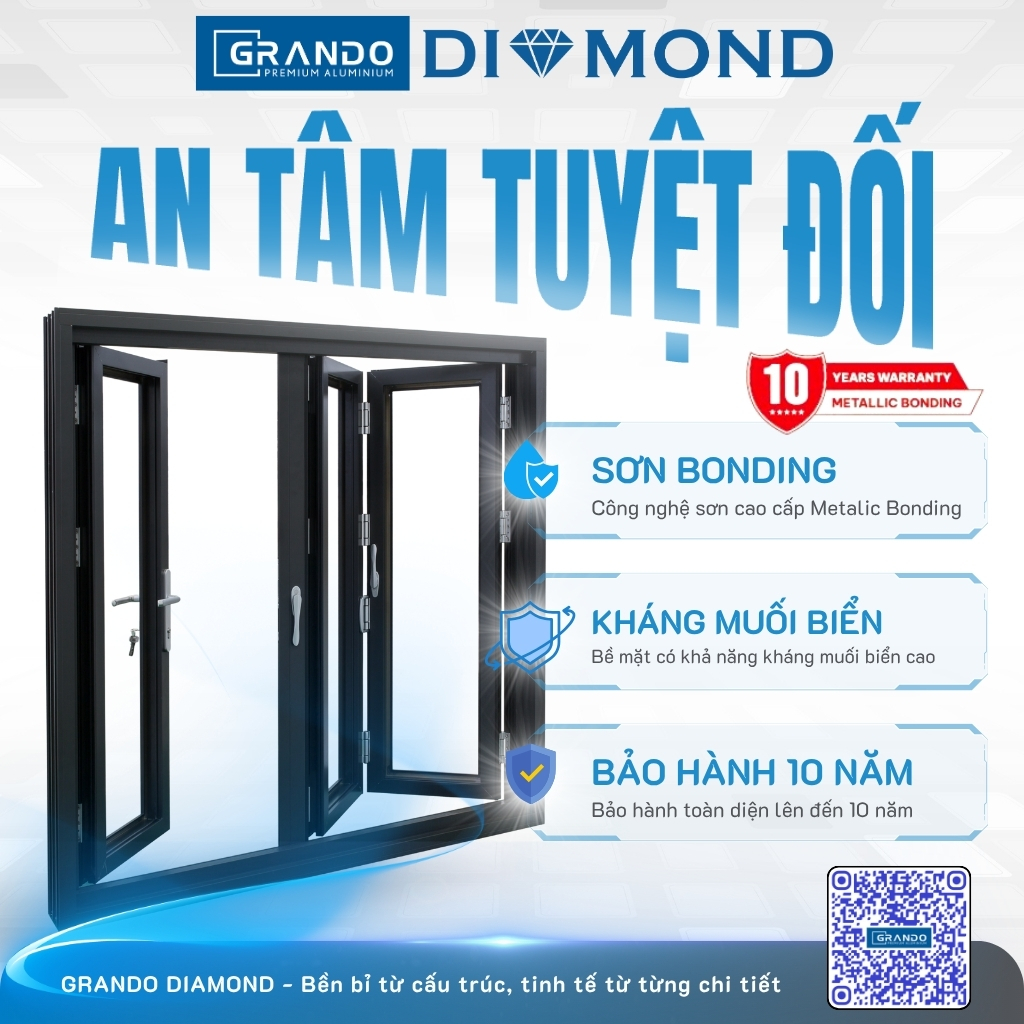 - Công nghệ sơn tiên tiến Bonding không chỉ giúp màu sắc bám chắc, mịn, ánh kim và sang trọng, mà còn tăng độ bền gấp nhiều lần so với các phương pháp truyền thống. Đây chính là yếu tố giúp Grando Diamond luôn nổi bật trong phân khúc cửa nhôm cao cấp.